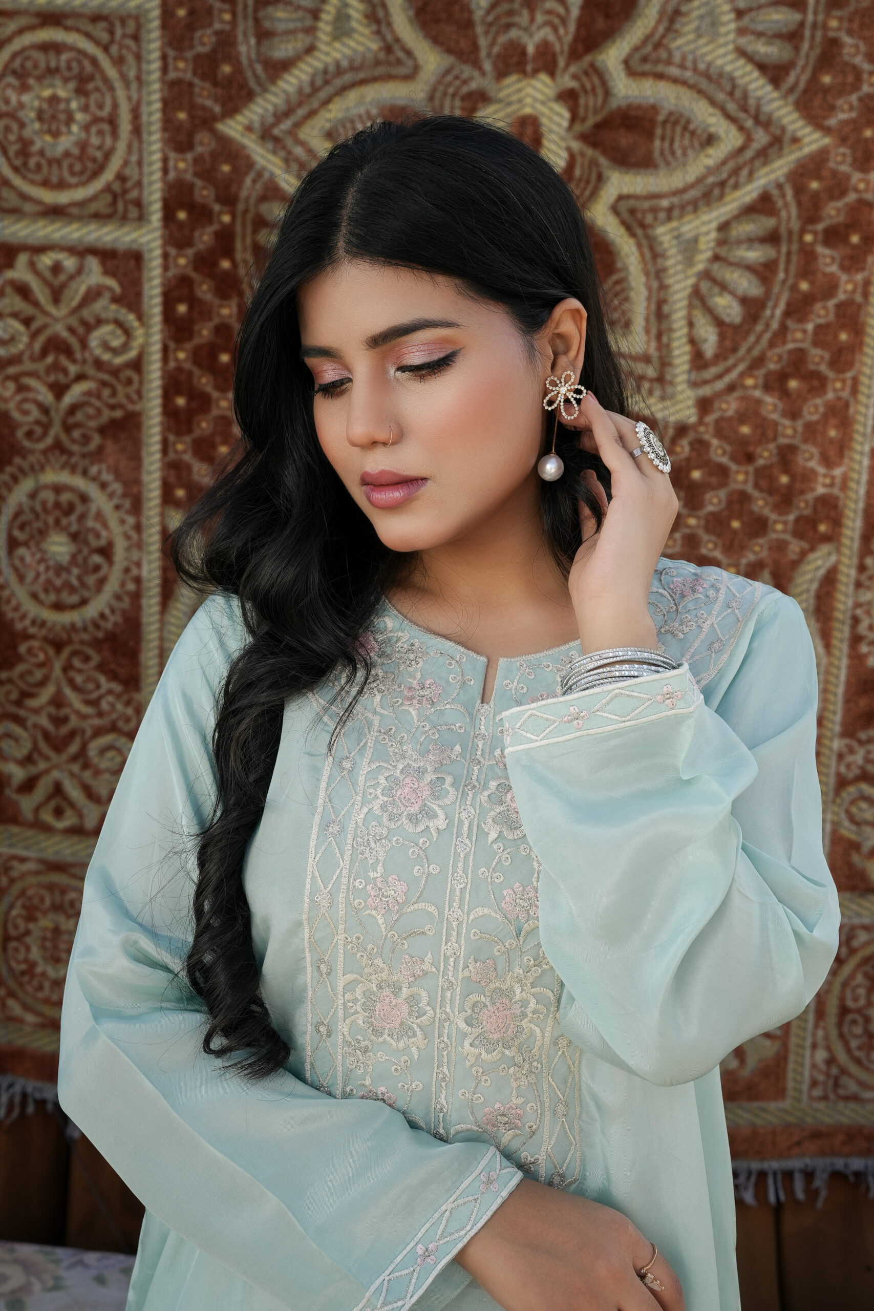 Dupatta: Matching Soft Blue Silk Dupatta with Understated Embroidery on Borders