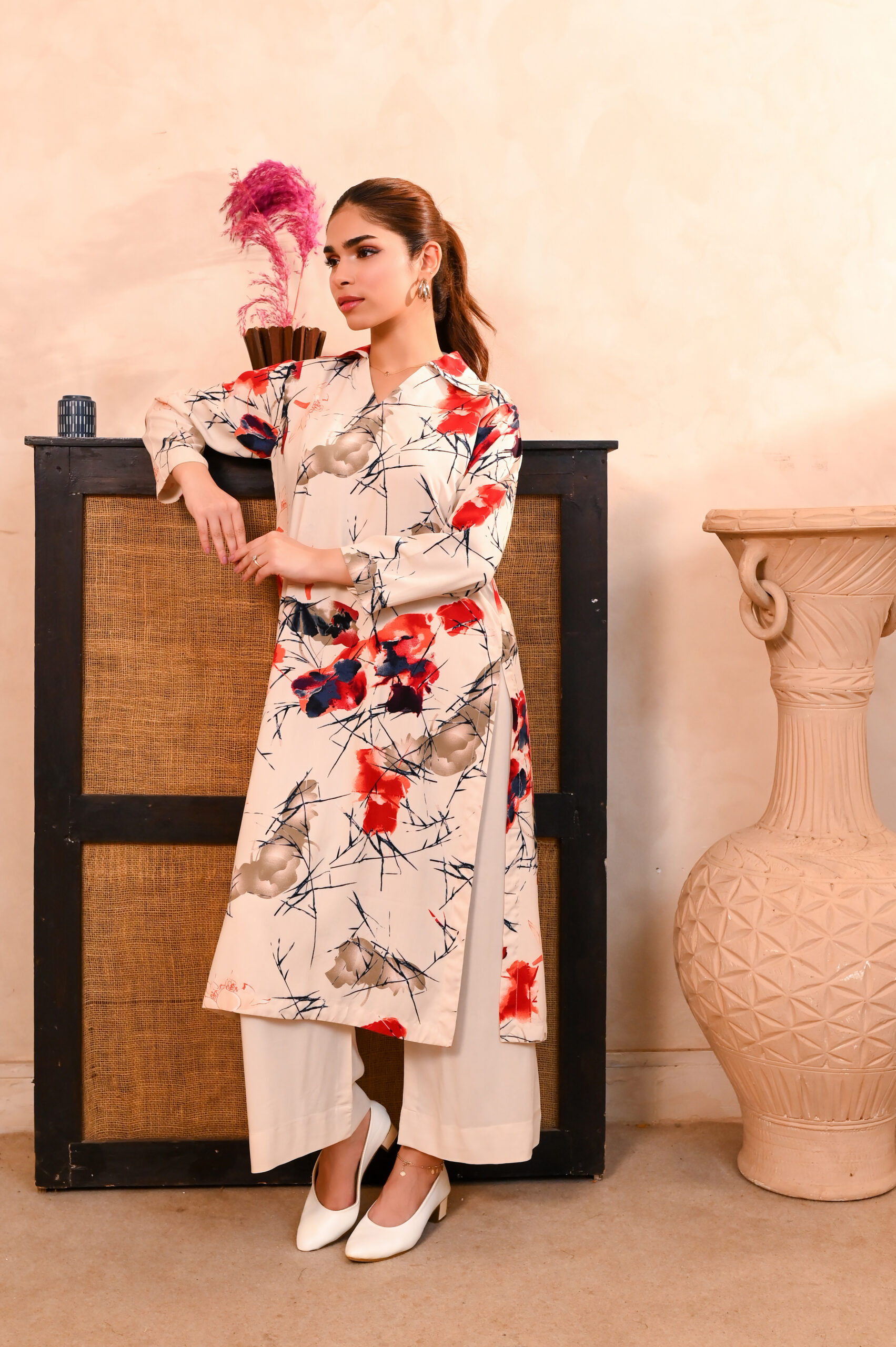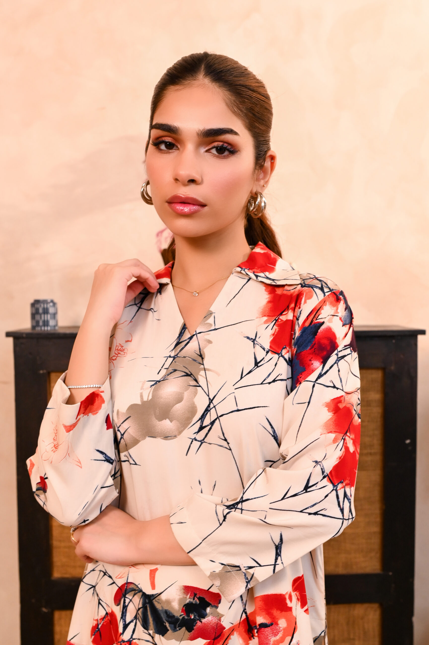 Modern Artistic Elegance — a neutral beige palette uplifted with vibrant red accents for a subtle statement. Ideal for Eid mornings, casual gatherings, and contemporary festive styling.