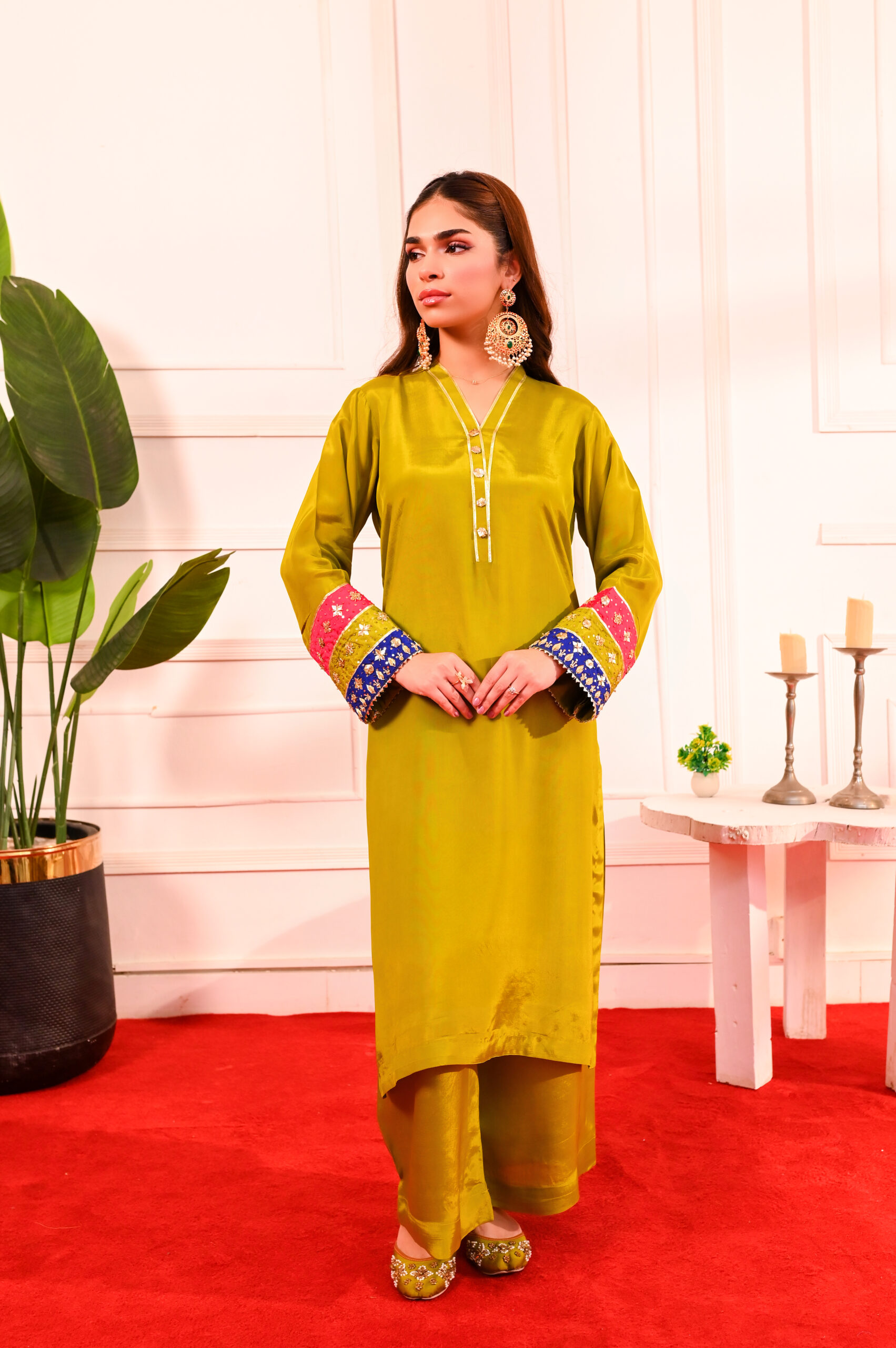 A refined straight-cut long shirt in a vibrant dhani green shade, designed with a clean and elongated silhouette. The neckline features delicate button detailing with minimal embellishment, adding understated elegance. The sleeves are beautifully highlighted with intricate multi-colored embroidered cuffs, bringing a festive contrast and artisanal charm to the ensemble.