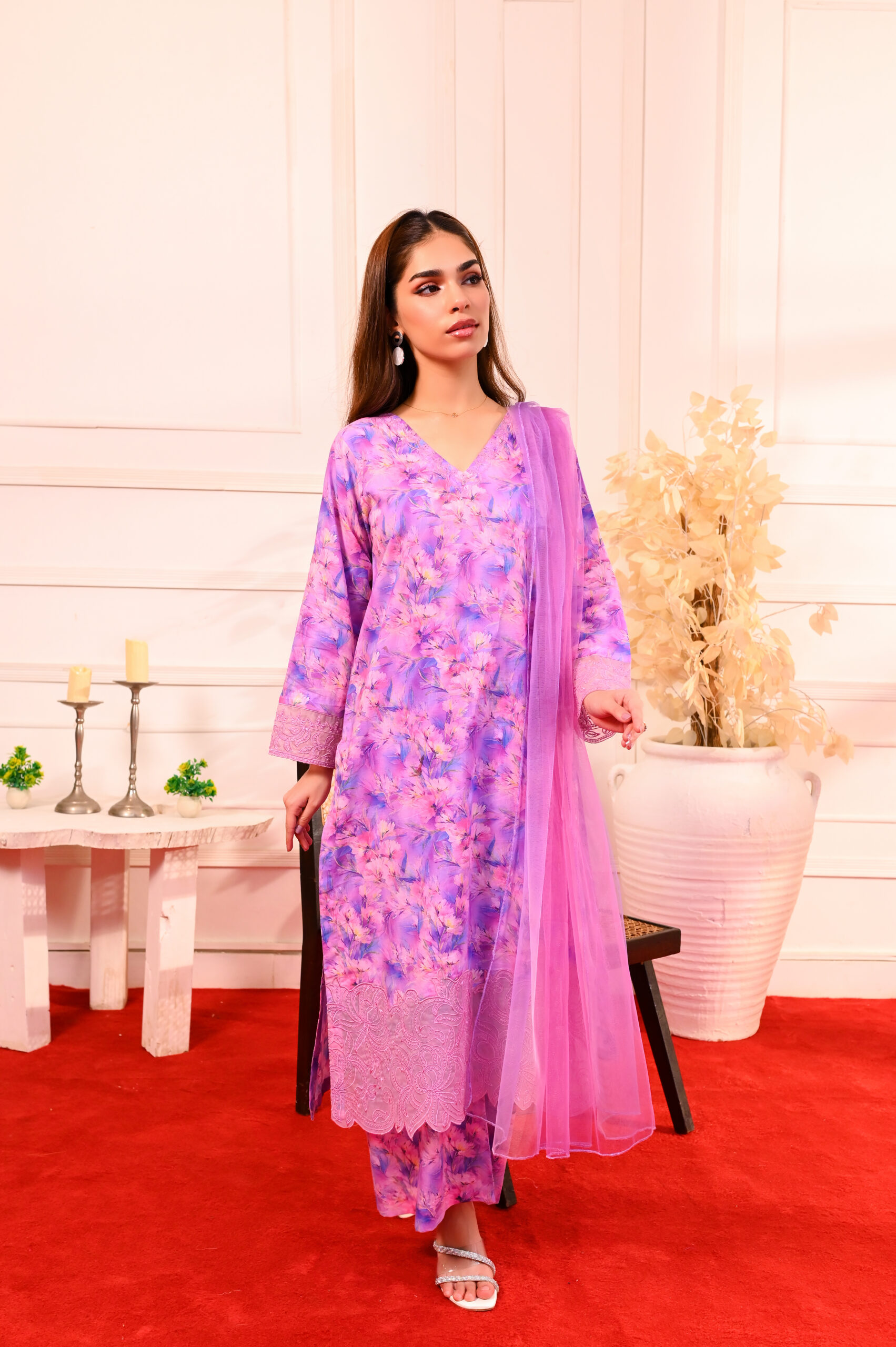 A lightweight net dupatta in a coordinating lavender tone, designed to drape effortlessly. The sheer texture adds softness and graceful movement, perfectly complementing the printed ensemble.