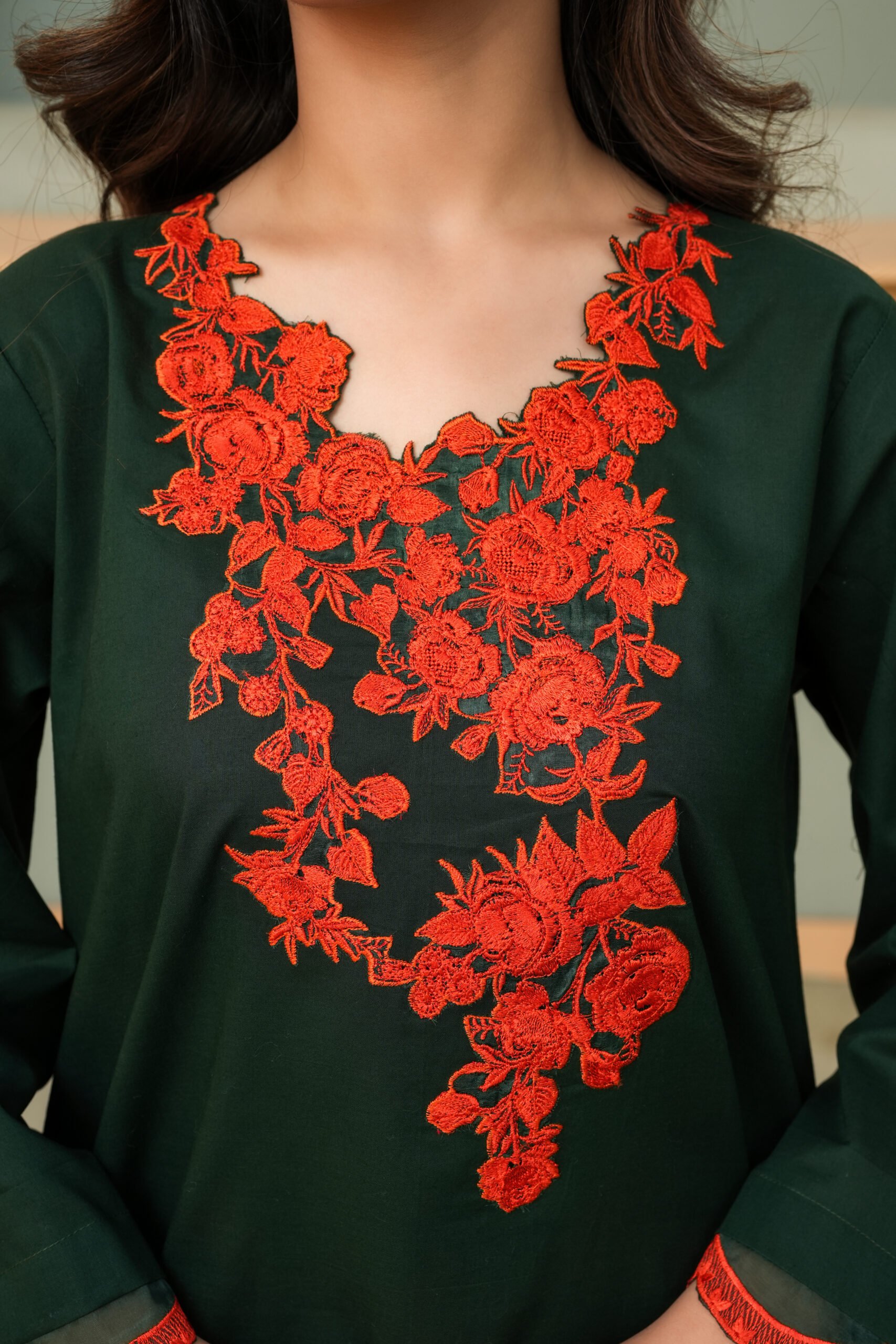 Neckline: Floral Embroidered Neckline in Orange & Red Tones