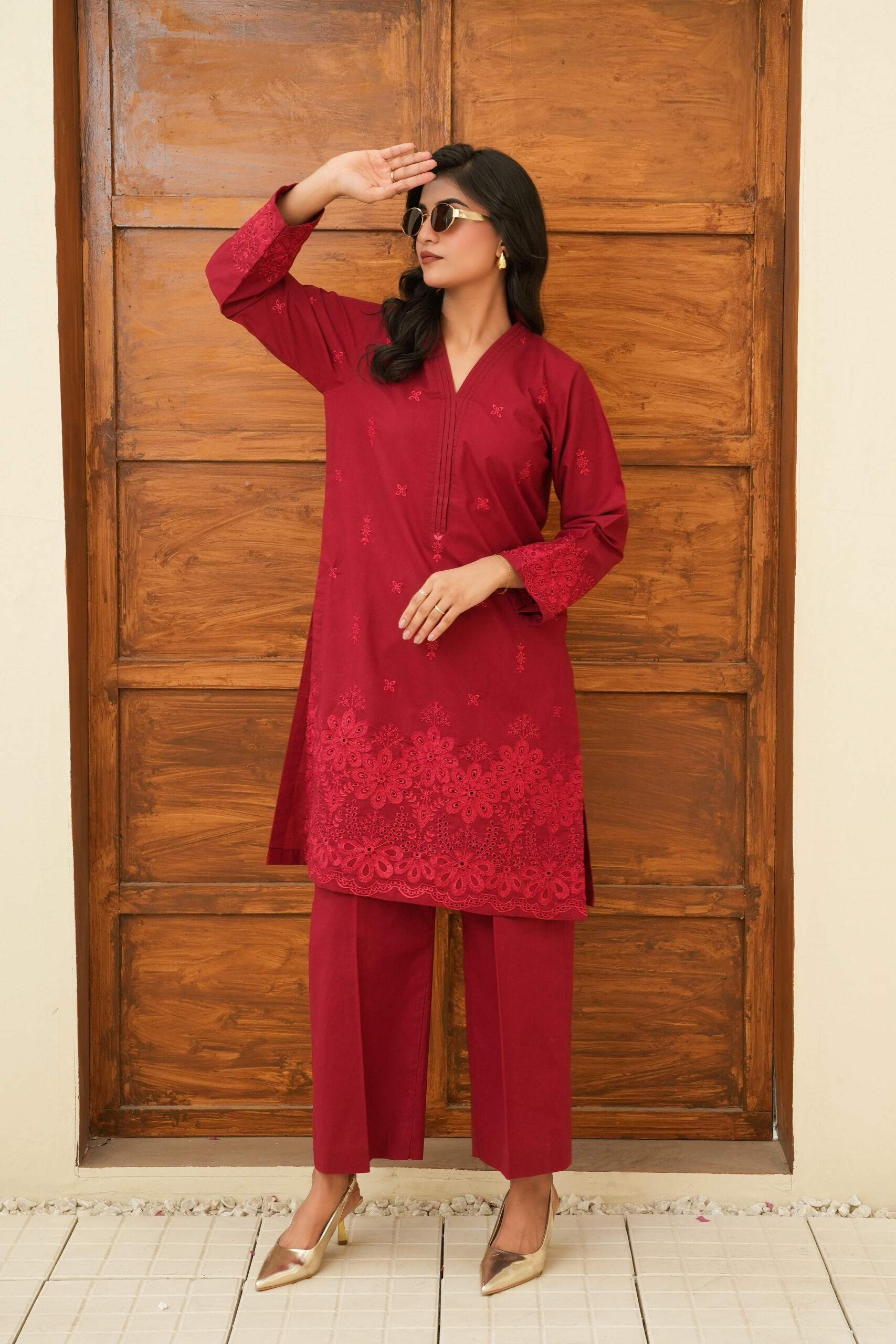 Top Details: Straight-cut shirt in a rich crimson red fabric, featuring a refined V-neckline with vertical pleated stitch detailing. The shirt is beautifully adorned with intricate tonal floral embroidery and delicate cutwork (schiffli) across the hemline and sleeve cuffs, offering a sophisticated, textured finish.