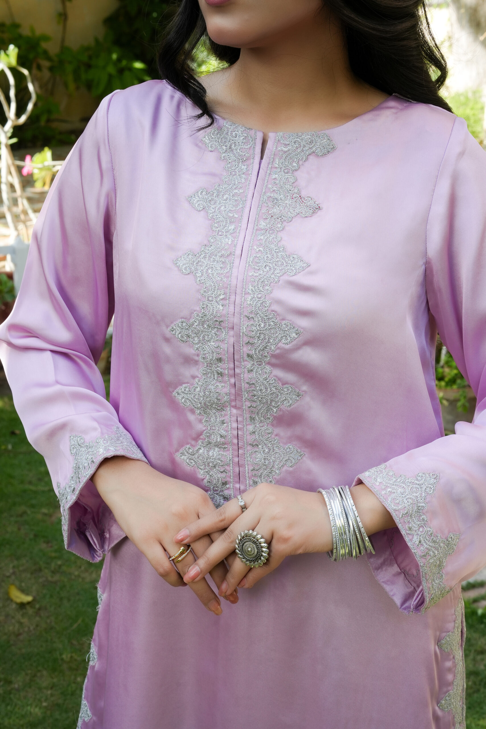 Top Details: A relaxed-fit straight shirt in a soft lilac-lavender shade featuring a clean round neckline. The center front is adorned with a broad, scalloped silver “zari” embroidery panel that adds a regal touch. Matching silver scalloped embroidery extends along the side slits and sleeve cuffs, creating a cohesive and polished look.