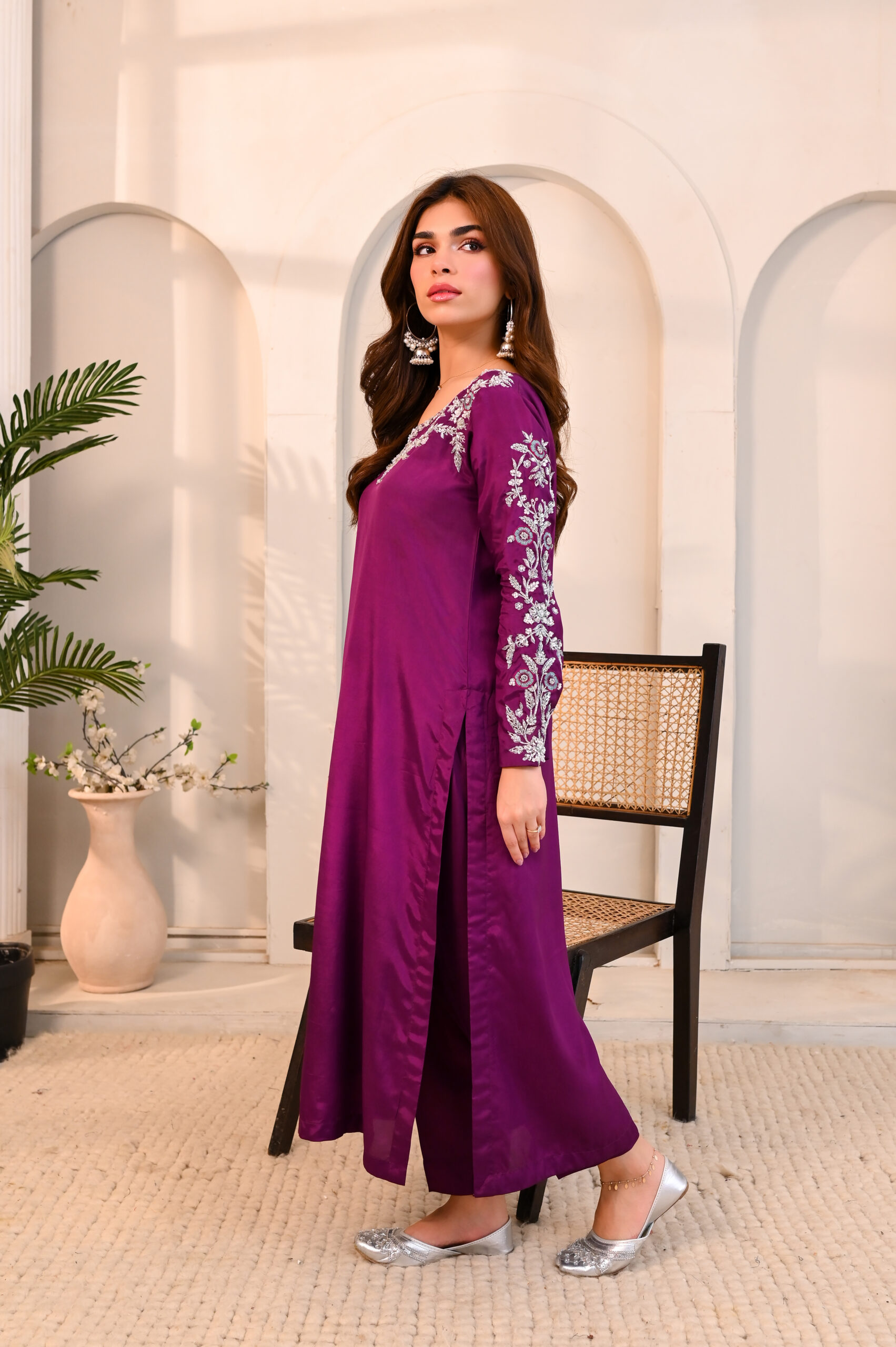 Top Details: A refined straight-cut long shirt in a rich dark purple shade, designed with a clean and elegant silhouette. The neckline is beautifully highlighted with intricate silver sheesha-inspired embellishments, creating a graceful focal point. The sleeves are finished with delicate matching detailing, adding a soft festive shimmer while maintaining a minimal and sophisticated look.