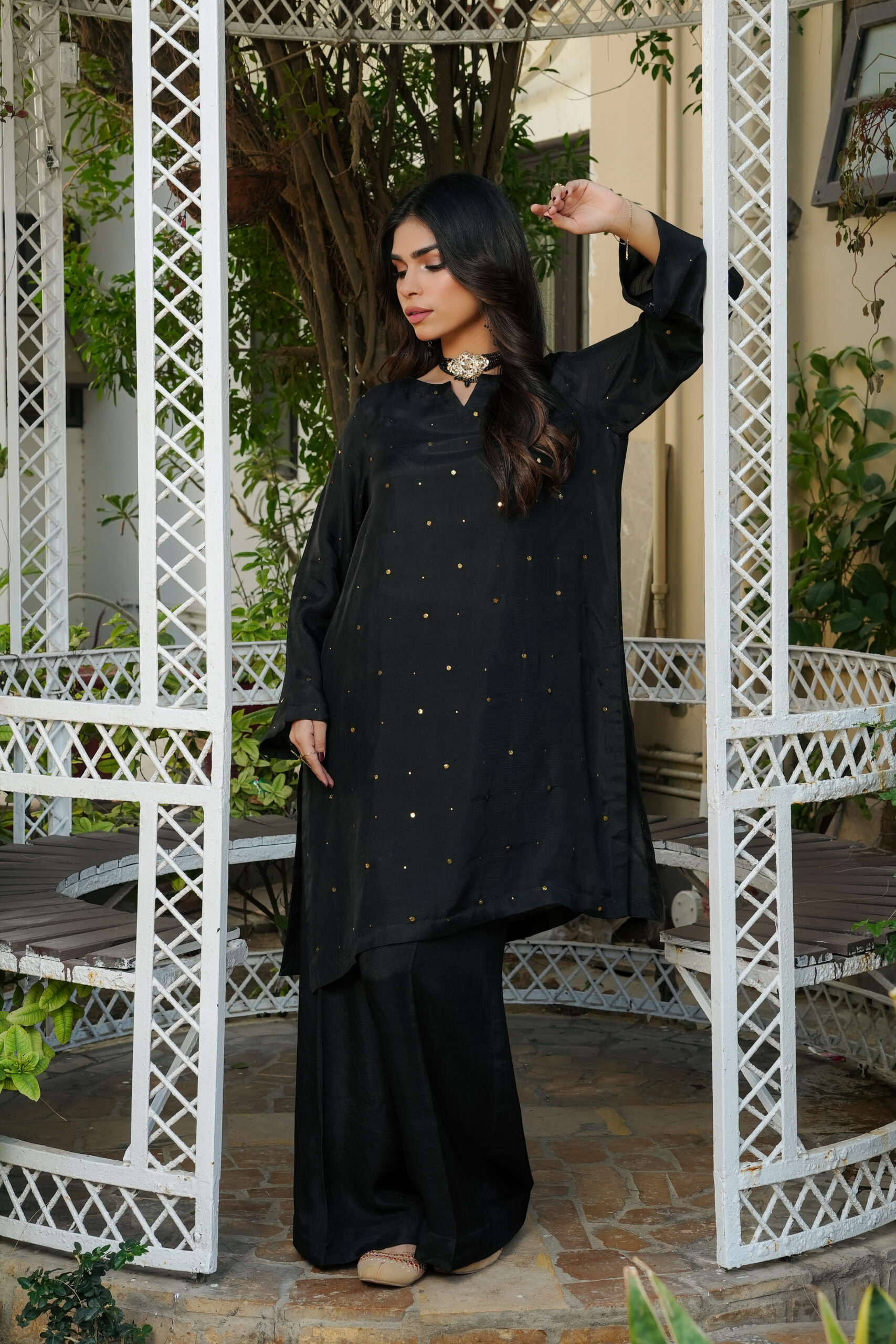 Top Details: A classic straight-cut shirt in a deep ebony black, featuring a sophisticated V-neckline with a clean, minimalist finish. The shirt is intricately adorned with delicate gold sitara (sequin) hand-work scattered across the front, catching the light beautifully for a subtle festive sparkle. The sleeves are designed with a relaxed fit, maintaining the outfit’s sleek and polished silhouette.