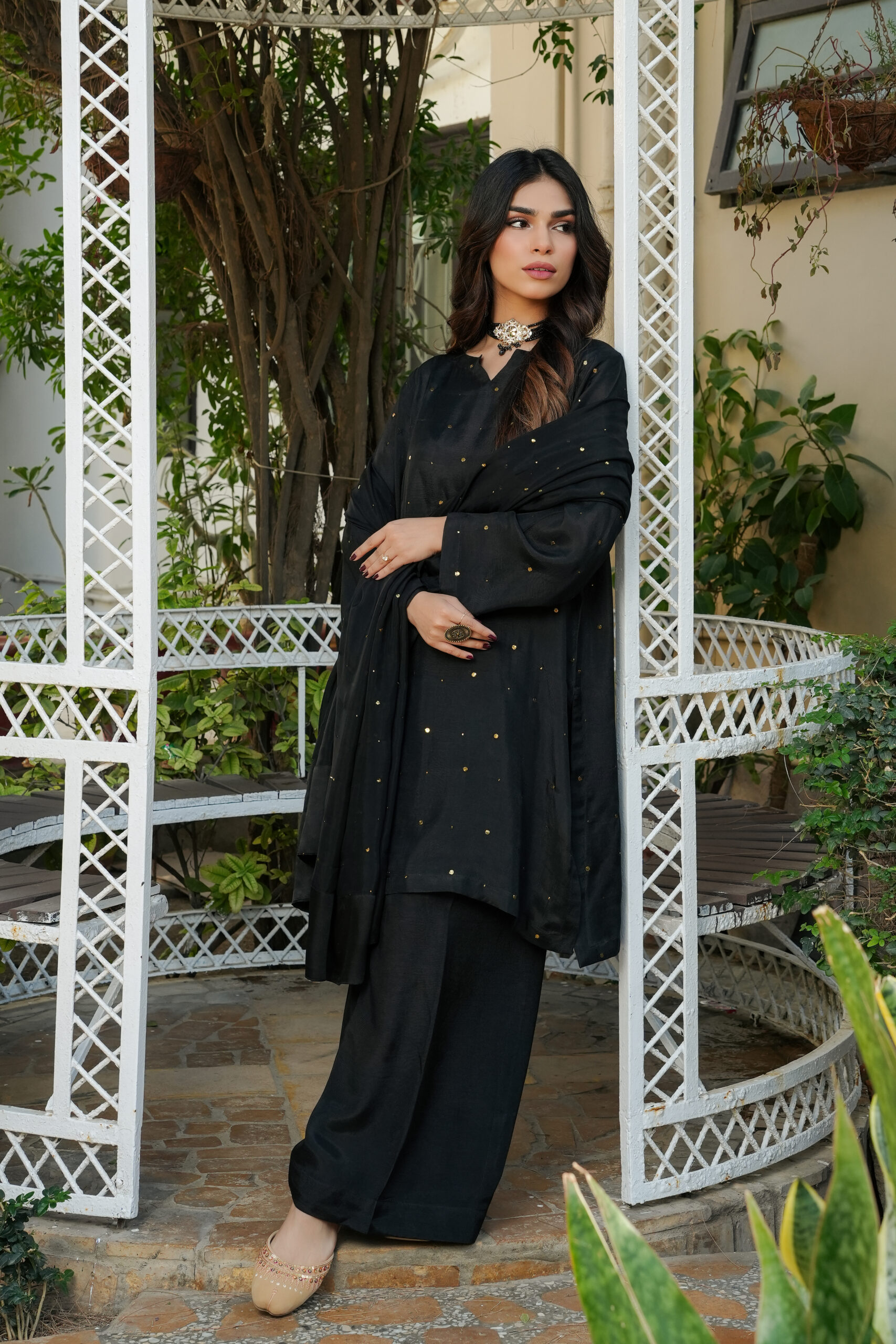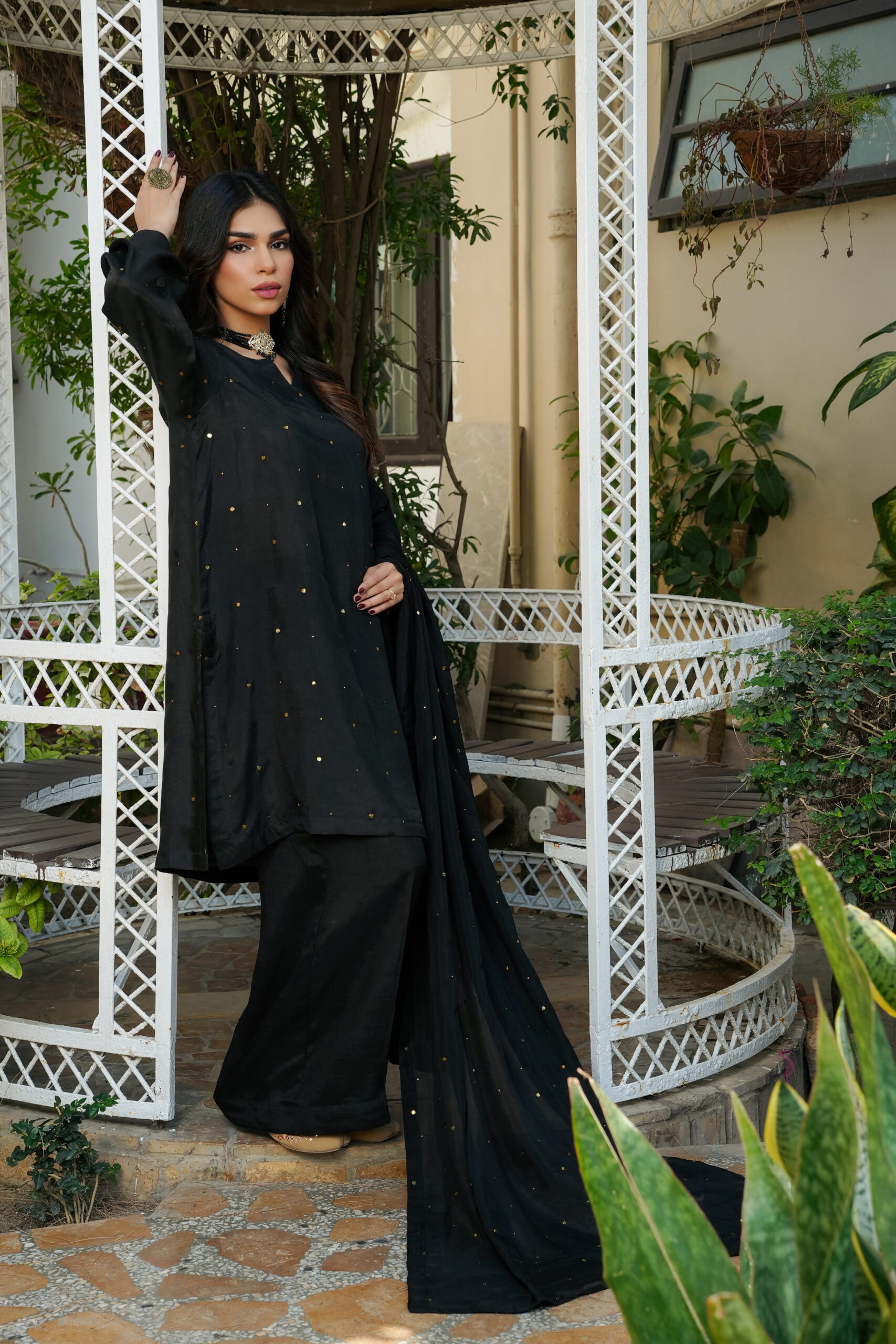 Design Aesthetic: Sophisticated Glamour — A timeless monochromatic ensemble that relies on the luxury of the fabric and minimal gold embellishments. It is paired with a matching flowing dupatta featuring gold sequin detailing, making it a perfect choice for evening formal events or festive dinners.