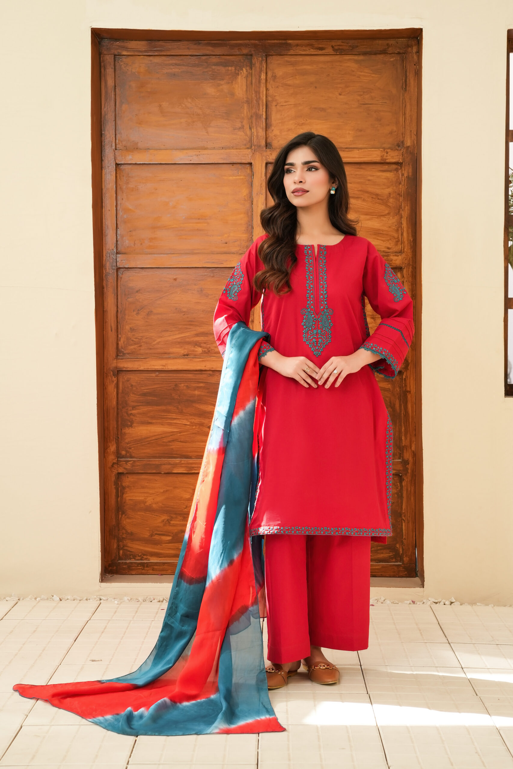 Collection: Pure Cotton Embroidered Top – Cotton Palazzo – Silk Tie-Dye Dupatta