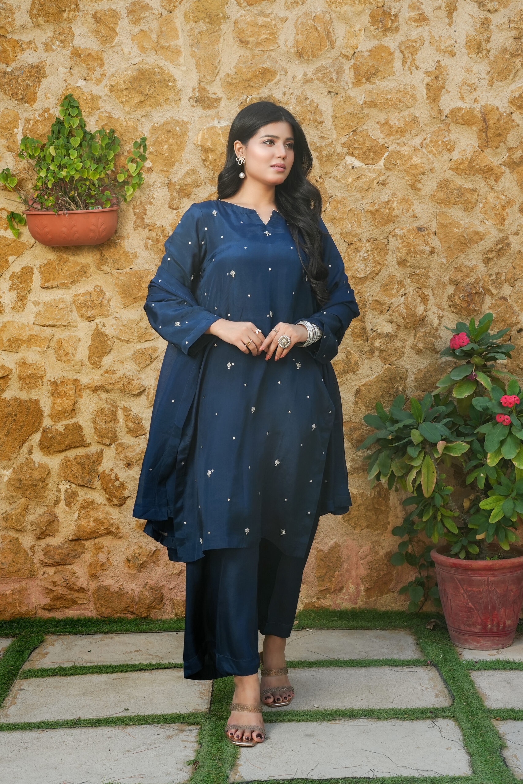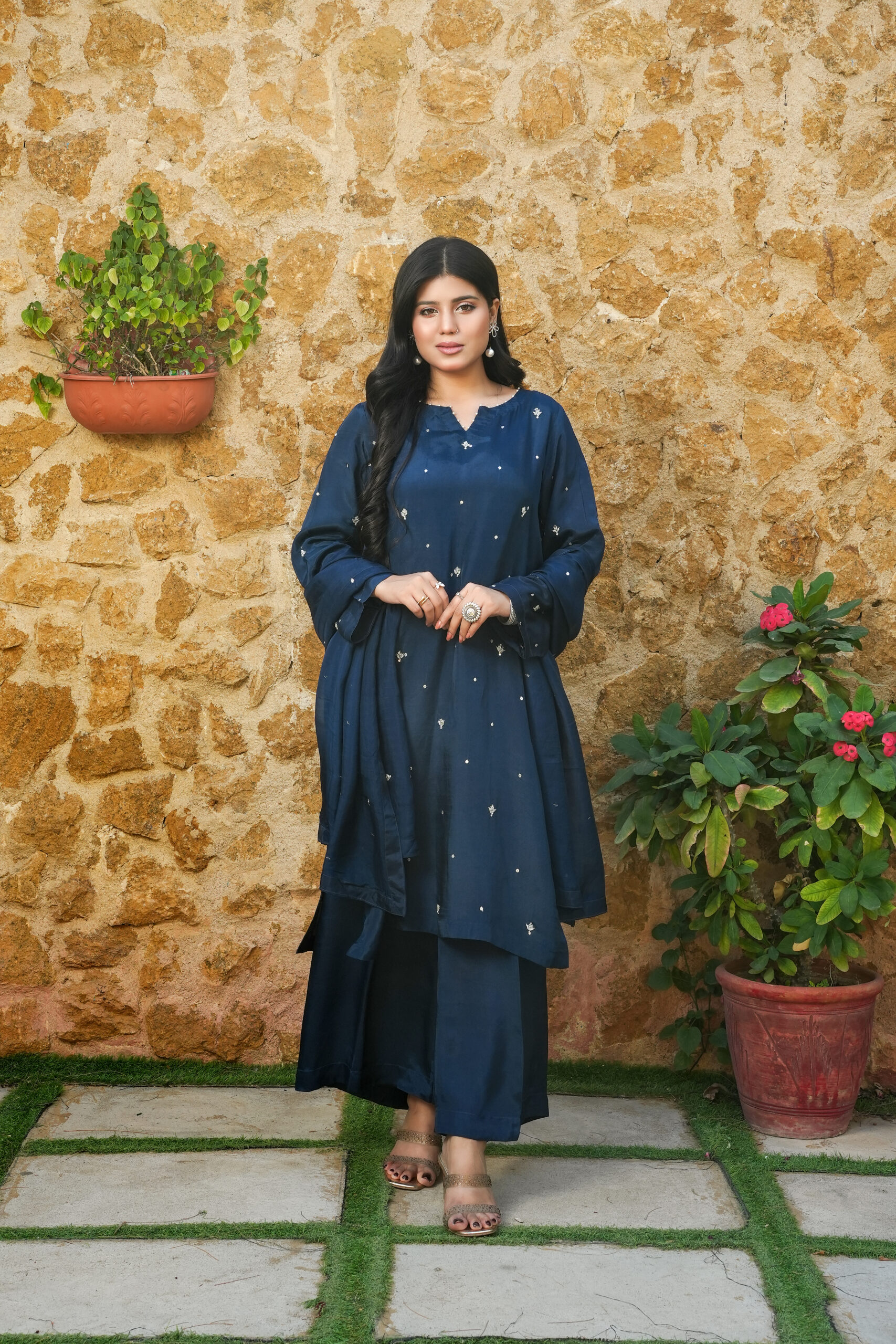 Dupatta Details: Coordinating navy blue sheer dupatta made from high-quality chiffon or silk-blend fabric. Features matching silver sequin or embroidery motifs scattered throughout to mirror the shirt’s design. Finished with smooth, folded borders for a refined and graceful fall.