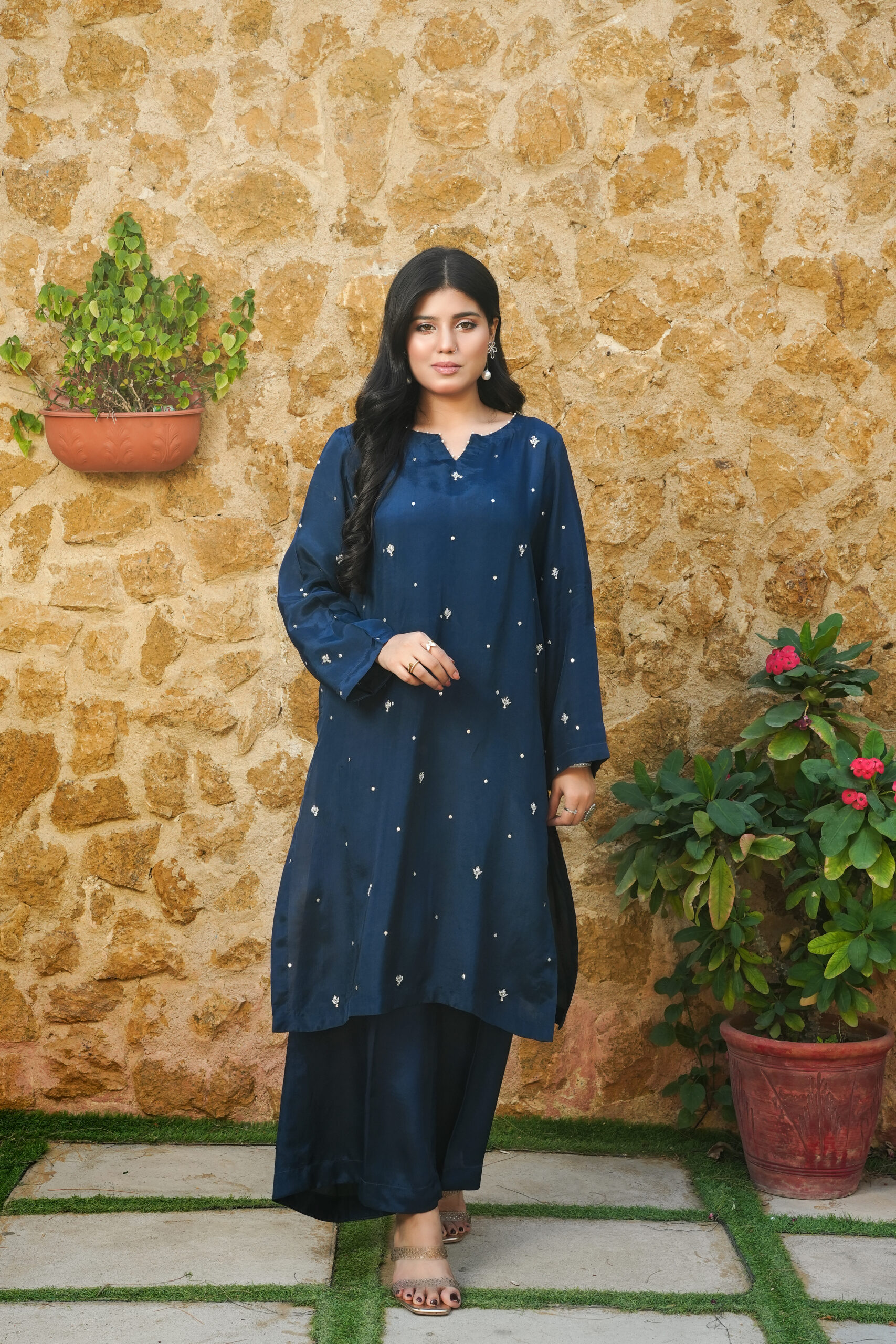 Top Details: A deep navy blue straight-cut shirt featuring a sophisticated small V-slit neckline. The front of the shirt is adorned with delicate, hand-finished silver floral “boti” embroidery and scattered micro-sequin (sitara) work for a starry, luminous effect. Clean, straight sleeves that maintain the outfit’s sleek and modern silhouette.