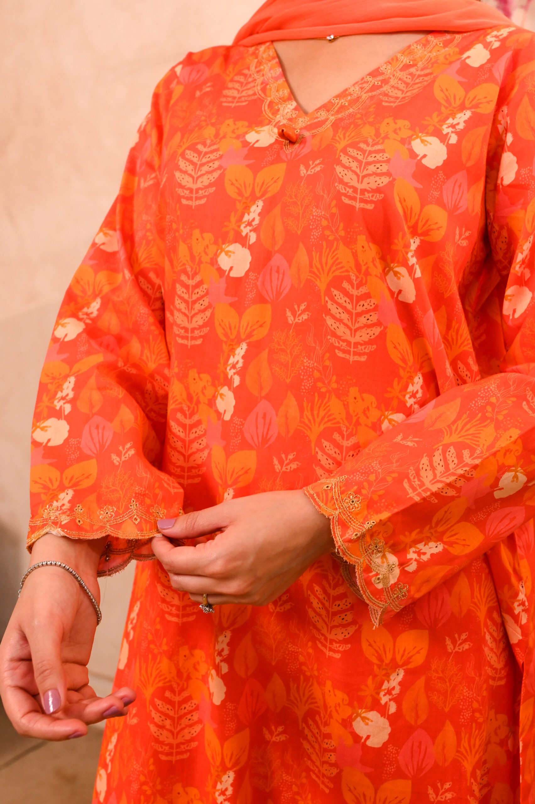 Bright Summer Festivity — a bold orange palette softened with delicate prints for a fresh and radiant Eid look. Perfect for daytime celebrations, family gatherings, and warm festive mornings.