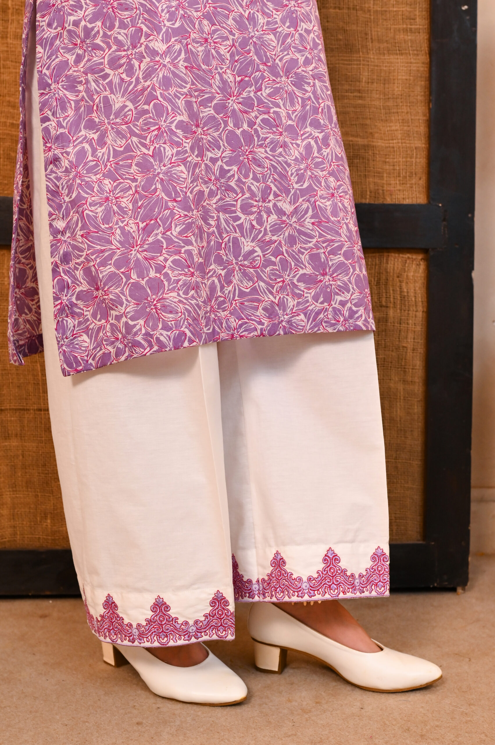 Soft white wide-leg trousers finished with a coordinated purple embroidered lace border at the hem, adding harmony and elevating the overall look with subtle sophistication.